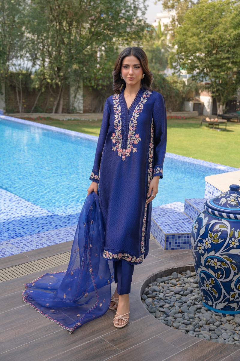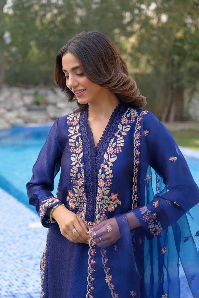 This royal blue -colored outfit is a vision of elegance! The self sheesha silk fabric drapes beautifully, and the intricate embroidery on the neck, corners, and sleeves adds a touch of refined artistry. The soft organza dupatta, adorned with delicate motifs and scalloped edges, completes the ensemble with an ethereal grace.