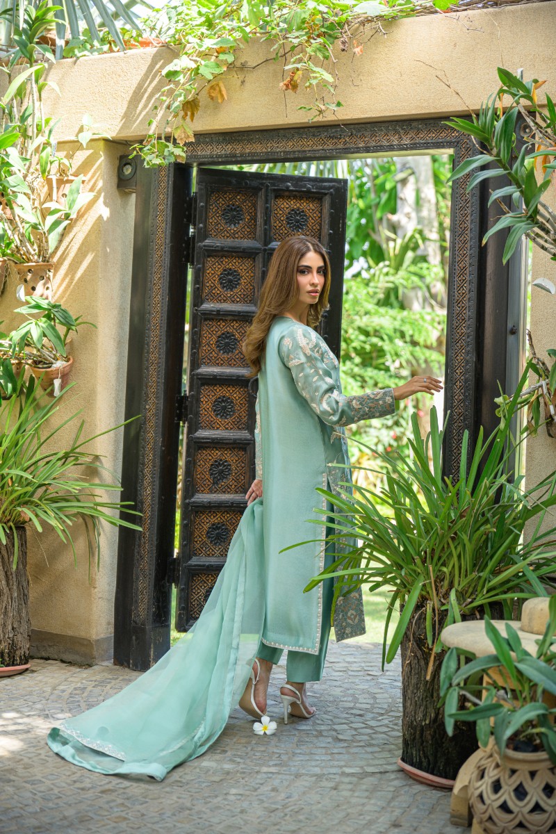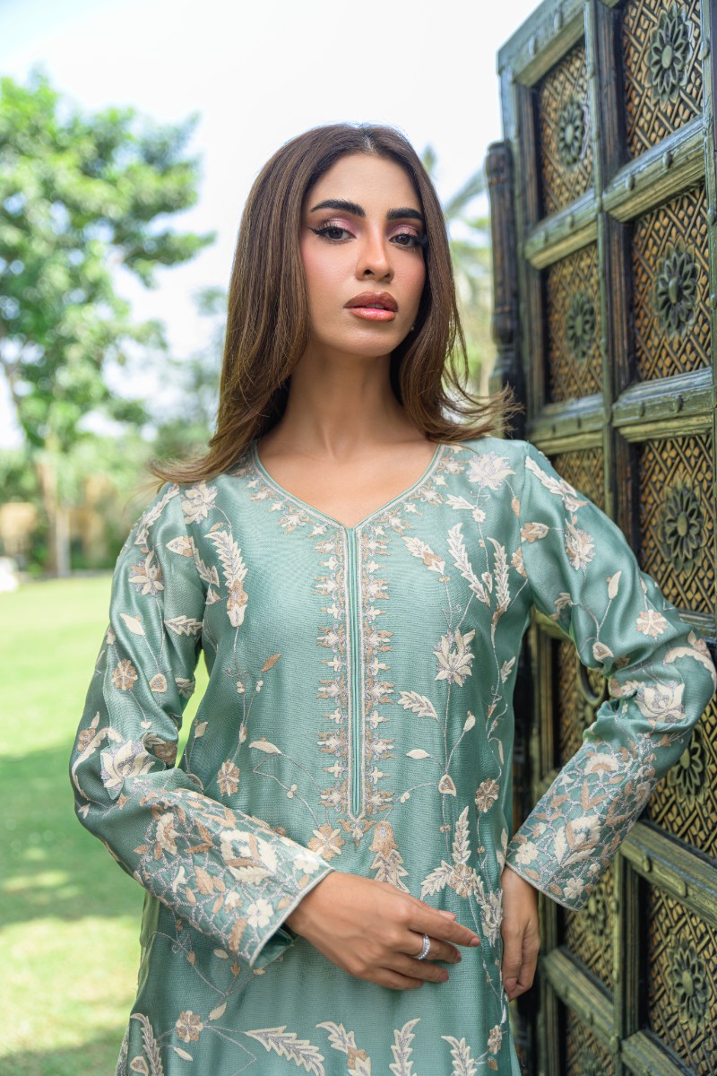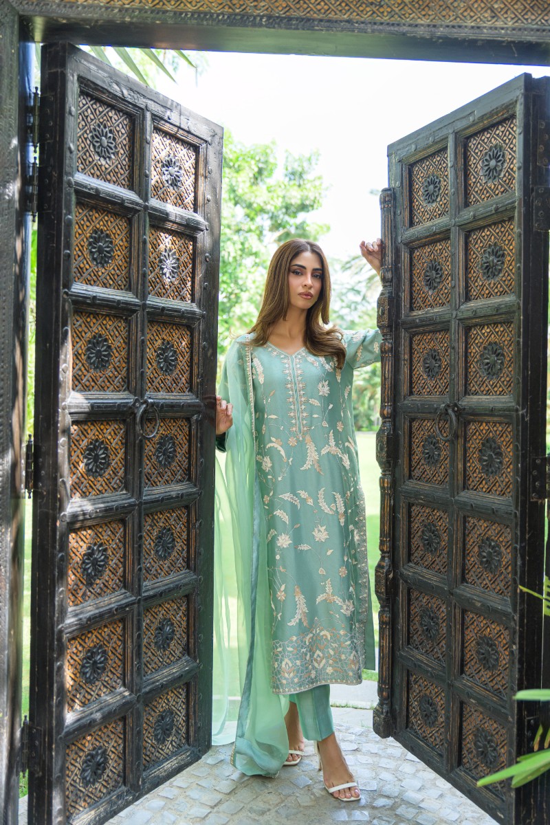 A soft, refreshing mint green brought to life with exquisite embroidery. The intricate zari work paired with subtle neutral tones creates a graceful harmony, while the organza dupatta, adorned with elegant borders on all four sides, completes the look to perfection. It’s an absolutely stunning choice for a special evening.